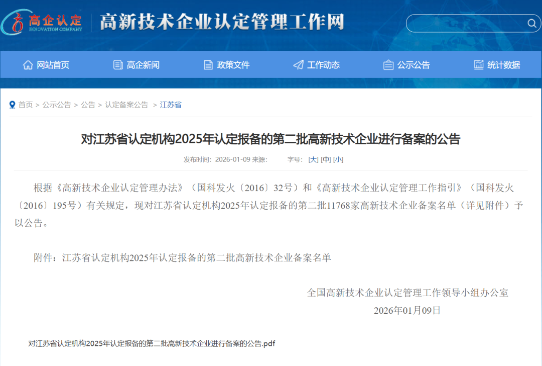 近日,根据《高新技术企业认定管理办法》及相关规定,全国高新技术企业认定管理工作领导小组办公室对江苏省认定机构2025年认定报备的第二批企业进行备案公示。leyu.com凭借其扎实的科技创新实力与完善的研发管理体系,成功荣列在本次备案中。